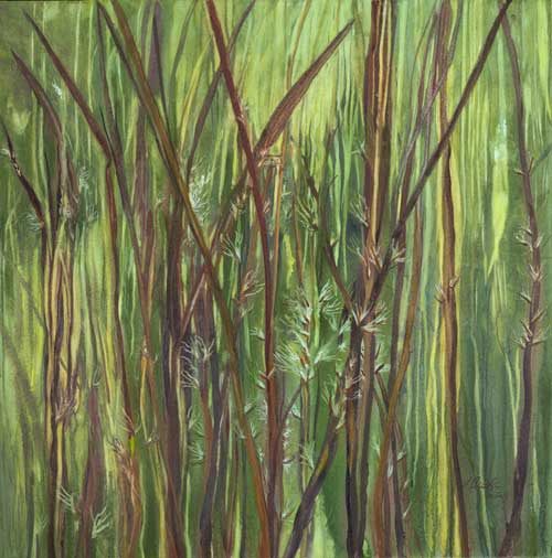 - The stems can reach 2.5 m in height. The leaf blades are blue-green when fresh and straw-colored when dry. The flowers are borne on the stem high above the leaves and are pinkish at full bloom.